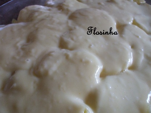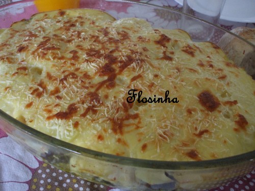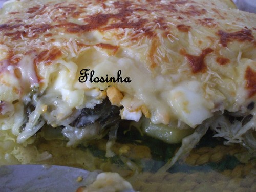 Por fim, rega-se tudo com o molho bechamel, polvilha-se com o queijo ralado e leva-se ao forno, previamente aquecido a 180º C, até gratinar. Retira-se e serve-se quente.