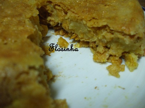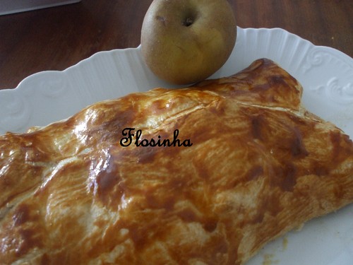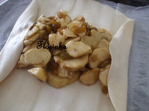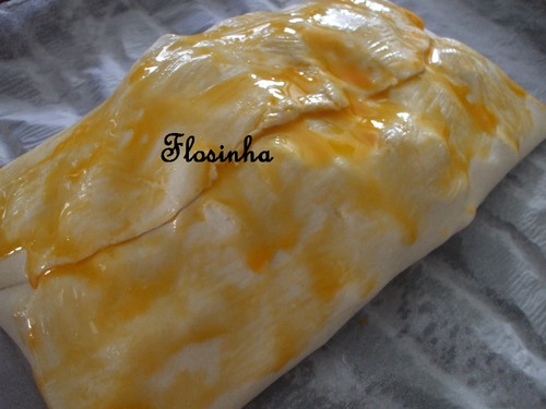 Num tabuleiro, polvilhado com farinha, estende-se a massa folhada em cima do papel vegetal em que vem enrolado. Coloca-se o recheio no centro e cobre-se com a massa, dobrando-a de forma a que o recheio fique bem tapado, para não haver fugas.
