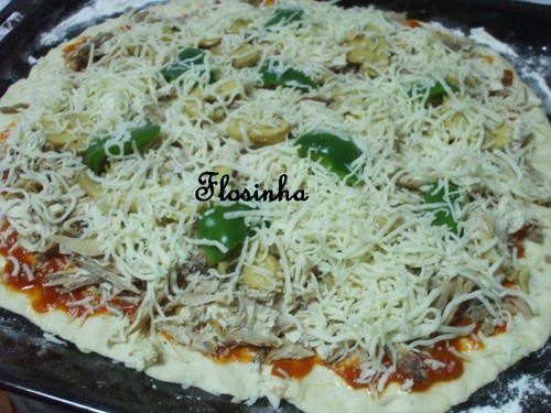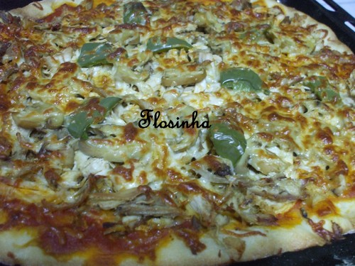 Algumas vezes ao domingo preparo uma pizza, usando alguns ingredientes que estão sobrando no frigorifico ou arranjando outros. Com isto, o que quero dizer é que dependendo da imaginação e do que temos á disposição podemos confeccionar deliciosas pizzas que são uma belissima opção para uma refeição ligeira.