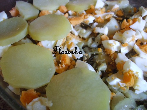 Dispõem-se alternadamente num pirex camadas de batata, espinafres, bacalhau, cebolas e ovos. A última camada deve ser de rodelas de batata.
