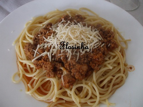 Coze-se a massa em água temperada com sal durante 8 a 10 minutos ou até estar macia. Serve-se o molho á bolonhesa a cobrir a massa, polvilhado com queijo ralado.