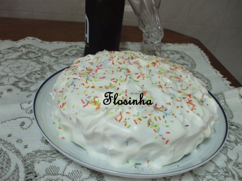 Parte-se 200g de chocolate branco em pedaços e leva-se a derreter em banho-maria, mexendo de vez em quando. Batem-se 3dl de natas em chantilly (sem açúcar) e junta-se ao chocolate morno, batendo sempre. Recheia-se e barra-se todo o bolo com esta mistura, polvilha-se com chocolate granulado a gosto e leva-se ao frigorifico até ficar frio. Serve-se.