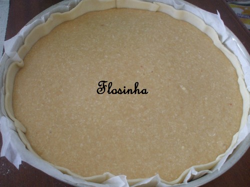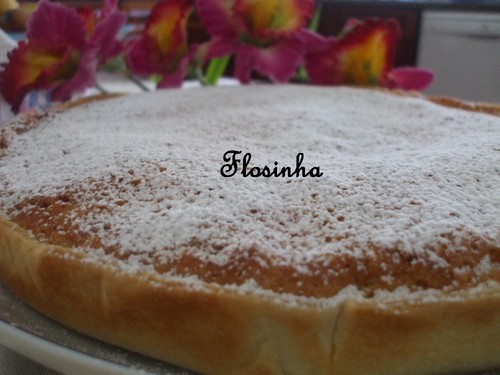 Deita-se o preparado anterior para a forma forrada e leva-se ao forno durante 40 minutos. Retira-se, deixa-se arrefecer, de seguida desenforma-se a tarte e serve-se polvilhada com açúcar em pó