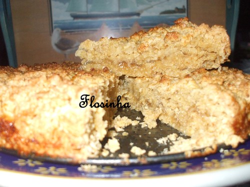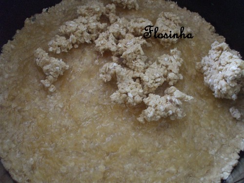 Mistura-se a margarina com o açúcar e a farinha, desfazendo a margarina de forma a que o preparado fique arenoso. Junta-se os flocos de aveia.