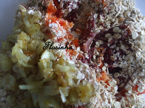 Coloca-se num recipiente o feijão, os flocos de aveia, a cenoura ralada, a salsa picada e o refogado da cebola. Tempera-se com o sumo de limão, os cominhos, a noz moscada, o sal e a pimenta.