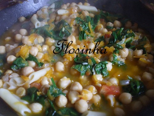 Adiciona-se o grão á mistura do tacho, assim como o caldo de legumes e deixa-se levantar fervura. Junta-se o macarrão, tempera-se com sal e pimenta, mexe-se e deixa-se cozinhar durante 10 minutos. Por fim adicionam-se os espinafres e deixa-se ferver mais 2 minutos.