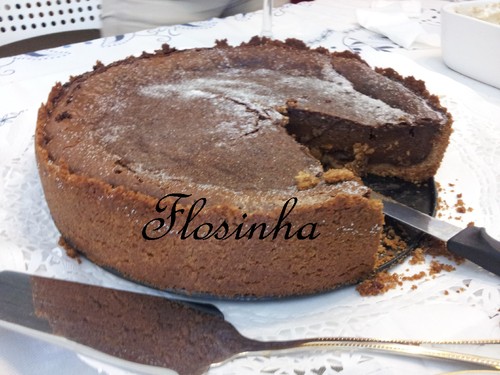 Parte-se o chocolate em pedaços e leva-se a derreter em banho-maria (ou no microondas), juntamente com as natas e o açúcar. Retira-se do lume e mexe-se bem. Adiciona-se os ovos um a um, mexe-se novamente e finalmente acrescenta-se o queijo creme. Depois de tudo bem misturado, deita-se na tarteira previamente forrada com a mistura de bolacha e leva-se a meio do forno a 180º cerca de 40 minutos, convém verificar com um palito, mas tendo em atenção que a textura da tarte é mole.