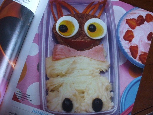 Esparguete com carne á Bolonhesa, a cara é uma fatia de queijo, os bigodes são tiras de cenouras cozidas, o laço é fiambre, olhos são rodelas de cenoura cozida e azeitona, a boca e nariz são tomate