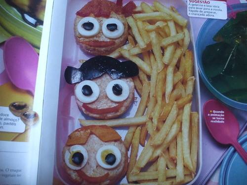 Hamburguers de Perú com batatas fritas, olhos rodelas ovo cozido e azeitonas, cabelos- tomate, cenoura, beringela, bocas- tomate