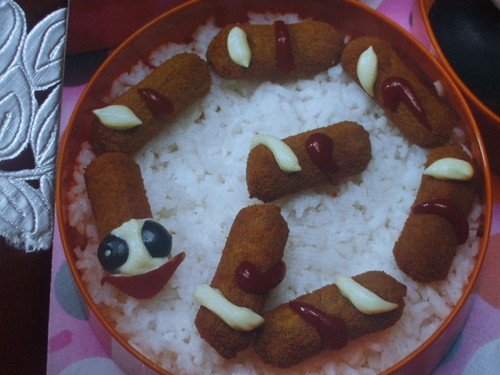 Croquetes de Carne ou Atum (em breve publico a receita dos croquetes de atum), decoração - maionese, ketchup, azeitonas e pimento vermelho