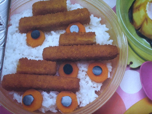 Lombinhos de pescada panados com arroz branco, Rodas- rodelas de cenoura cozida e azeitonas